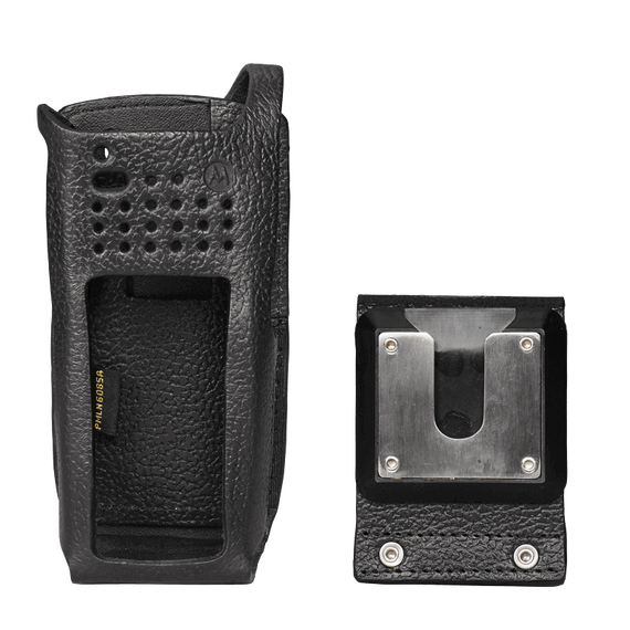 Carrying cases are available in sizes designed to fit your radio and battery and permit audio to be heard clearly. This hard leather carrying case with 2.5-inch swivel belt loop is designed for use with the APX 4000 radio. Swivel model cases secure to a belt loop and allow the case to swing freely from side to side. The swivel latch system also allows the radio and case to be removed from the belt loop by simply inverting the case and lifting it up and out of the belt loop.