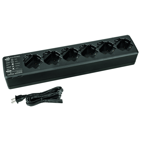 Multi- unit charger for EVX-S24 Lithium-Ion batteries or radios. It can charge up to 6 EVX-S24 radios or batteries at one time. It has built-in individual LED status red, green, orange to show when the battery is rapidly charging, near completion, complete and battery check - waiting to charge. This charger can be mounted to the wall to save space.